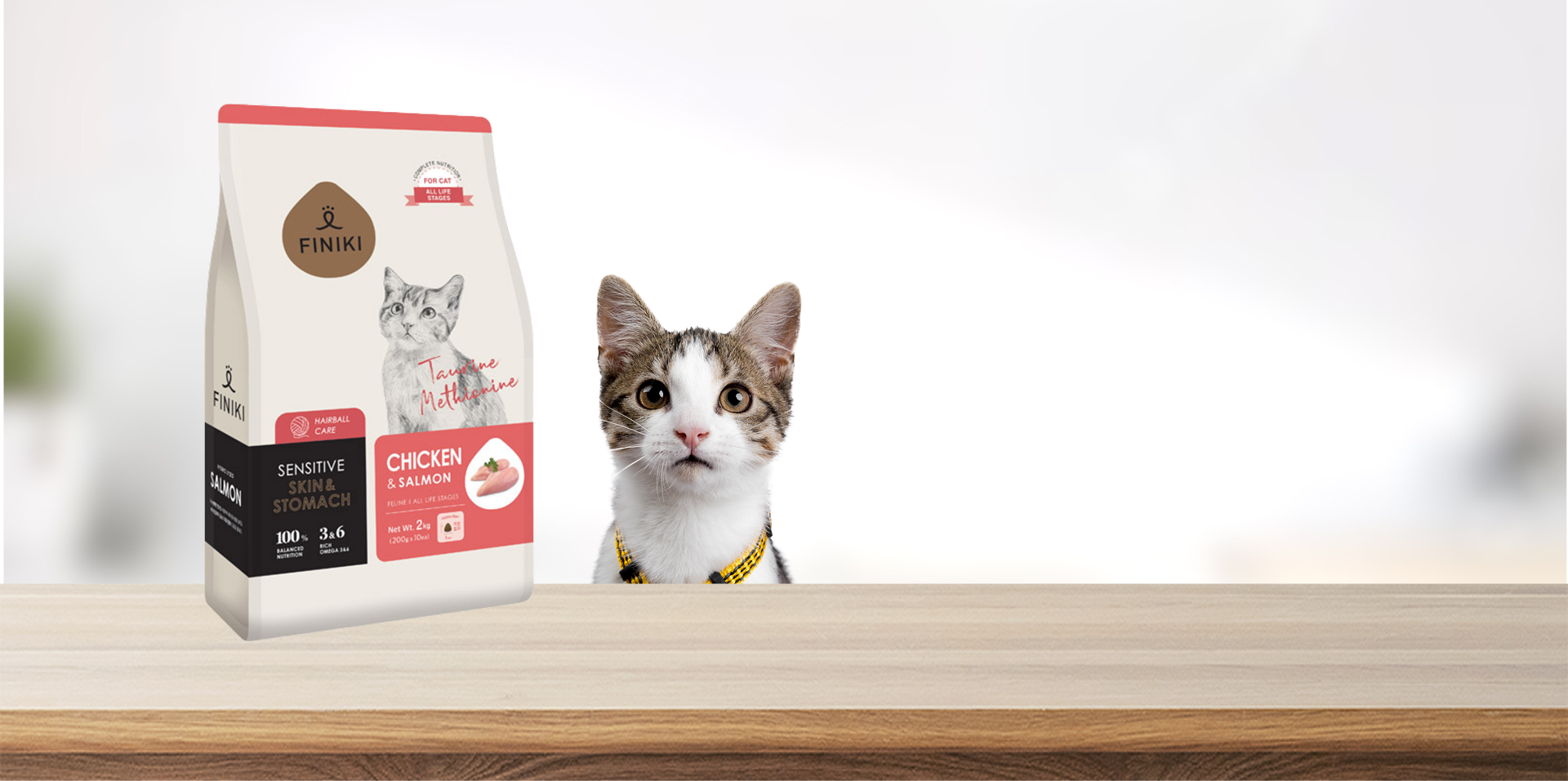 Introducing our Sensitive Skin & Coat – Chicken & Salmon, a premium formula meticulously crafted to meet AAFCO standards for complete and balanced nutrition. Packed with 30% crude protein and 12% crude fat, this recipe includes hydrolysed proteins to support digestion, minimise allergies, and taurine for eye and cardiovascular health. Rich in Omega-3 and Omega-6 for a glossy coat, it also features our Finiki Bite low-grain kibble, gentle on sensitive teeth, gums, and stomachs. Individually packaged for lasting freshness, it’s the ideal daily meal for cats of all ages.
