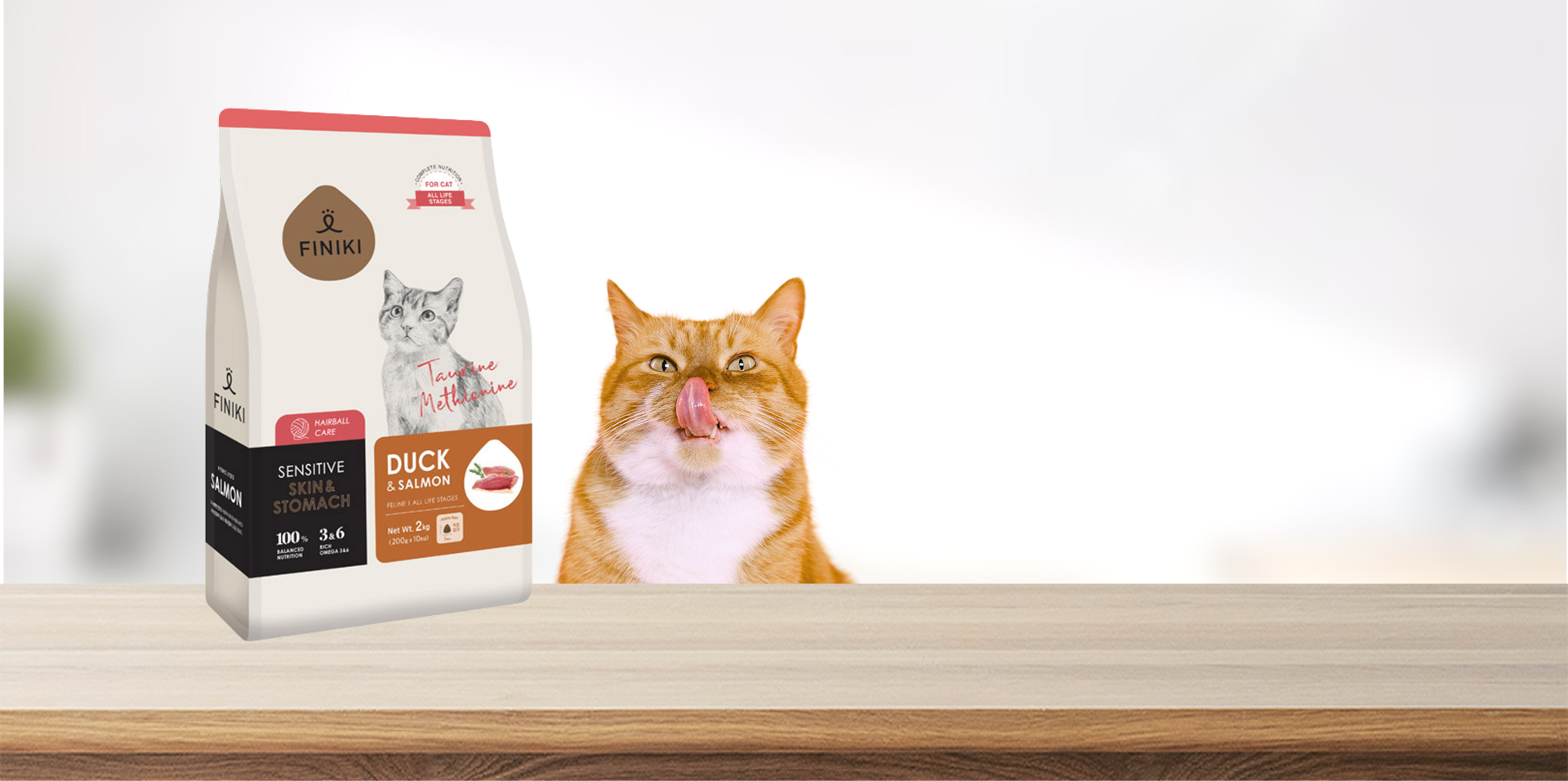 Introducing our Sensitive Skin & Coat – Duck & Salmon, a premium recipe formulated to meet AAFCO standards for complete and balanced nutrition. Packed with 30% crude protein and 12% crude fat, it features high-quality duck and hydrolysed salmon to support digestion, immunity, and a glossy coat. Enriched with balanced minerals for urinary tract health, Omega-3 and -6 for skin vitality, and taurine for cardiovascular and eye function, it comes in our low-grain Finiki Bite kibble—perfect for sensitive teeth, gums, and stomachs. Individually packaged for lasting freshness, it’s an ideal daily meal for cats of all ages.
